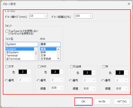 文字や矢印、引き出し線のスタイルを設定し、[OK]ボタンをクリックします。