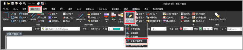 [基本作図]タブの[文字編集]プルダウンメニューから[全角/半角変換]コマンド(