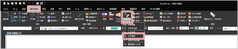 [基本作図]タブの[文字編集]プルダウンメニューから[文字置換]コマンド(