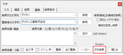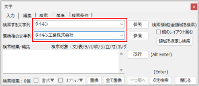 [検索結果・編集]に検索された文字列が表示されます。図面上では、検索された文字列の色が変わります。