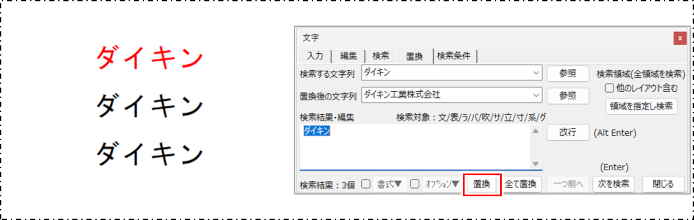 以降、[置換]ボタンをクリックするごとに選択文字が置換されます。置換を終了する場合は、[閉じる]ボタンをクリックします。