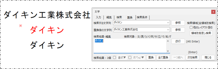 図面に配置された文字を検索し、他の文字に置換します。文字の種類や書式について条件を指定して検索することや、置換後の文字の書式を設定することもできます。
