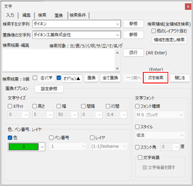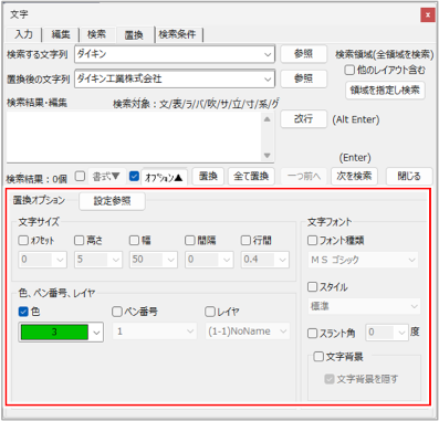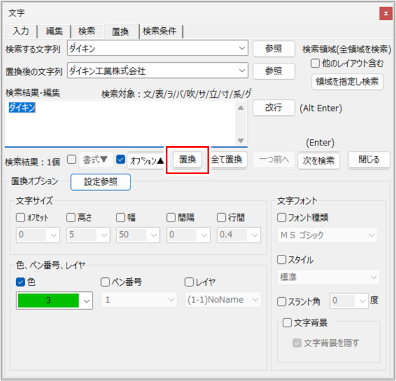 文字の色、ペン番号、レイヤについて、置換後の書式とする項目にチェックを付け、設定を選択します。 |