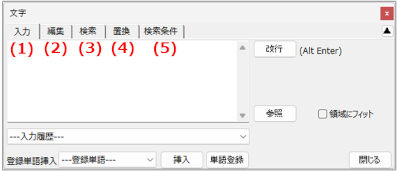 文字に関する操作の多くは、[文字]ダイアログで行います。[文字]ダイアログは、図面上の文字をダブルクリックすると表示されます。[文字]ダイアログには、[入力][編集][検索][置換][検索条件]のタブがあり、操作に応じてタブを切り替えて使用します。