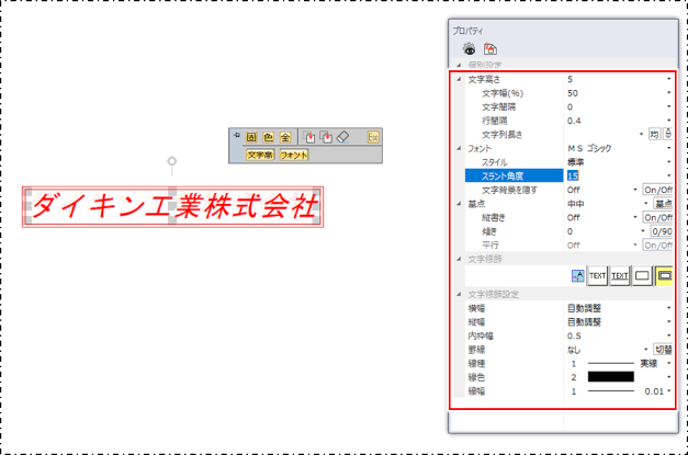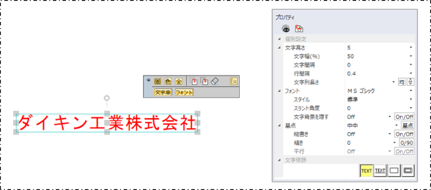 [プロパティ]で設定を変更すると、選択した文字列に反映されます。