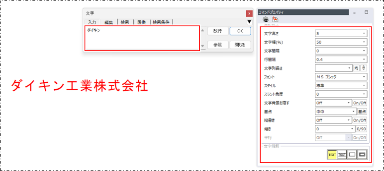 [文字]ダイアログの[編集]タブで文字列の内容を編集し、必要に応じて[コマンドプロパティ]で書式を変更します。