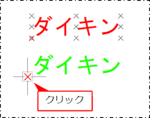 [コマンドプロパティ]で[文字基点に点を表示]を[On]にすると、図面上にある文字のすべての基点に「×」が表示されます。