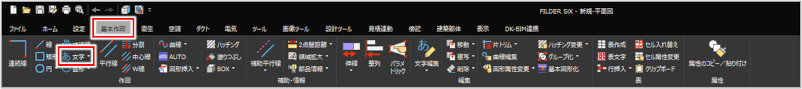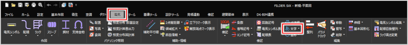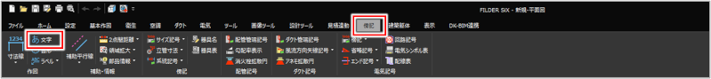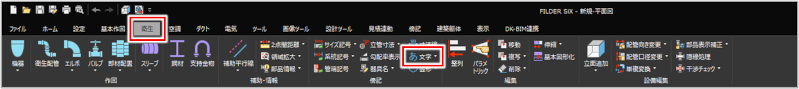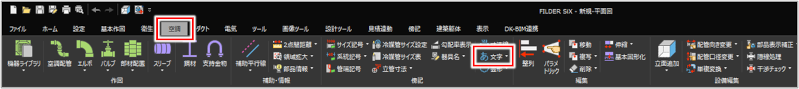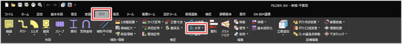 [基本作図]タブ>[文字] [衛生]タブ>[文字] [空調]タブ>[文字] [ダクト]タブ>[文字] [電気]タブ>[文字] [傍記]タブ>[文字] |