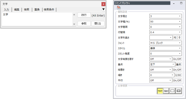 [文字]ダイアログと[コマンドプロパティ]が表示されます。