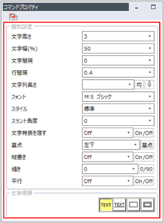[コマンドプロパティ]で文字の高さ、幅、間隔などを設定します。