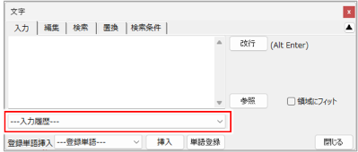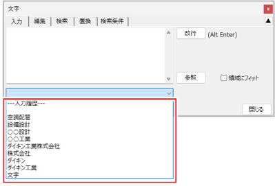 図面に配置した文字は、最新の10件までが入力履歴として記録されています。入力履歴の文字は、[文字]ダイアログから呼び出して図面に配置できます。