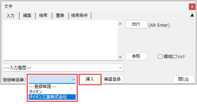 登録した単語は、[文字]ダイアログの[登録単語挿入]プルダウンメニューから選択できます。単語を選択して[挿入]ボタンをクリックすると、選択した文字列が入力欄に表示されます。