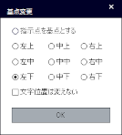 文字の配置の基準となる点を選択します。 [基点]ボタンをクリックすると[基点変更]ダイアログで基点を設定できます。