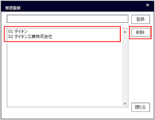 登録した単語を削除するときは、[単語登録]ダイアログで単語を選択し、[削除]ボタンをクリックします。