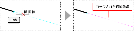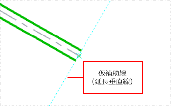 仮補助線は、作図中に座標アシストが表示された際に自動的に表示される水平線、垂直線、延長線などの一時的な補助線です。コマンドキャンセルすると自動的に消えます。