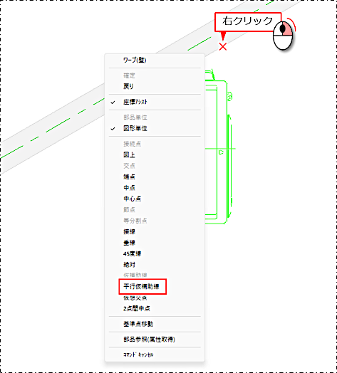 線分を右クリックして表示されるメニューの[平行仮補助線]をクリックすると、右クリックした線分と同じ角度の仮補助線が基準点にロック状態で表示されます。