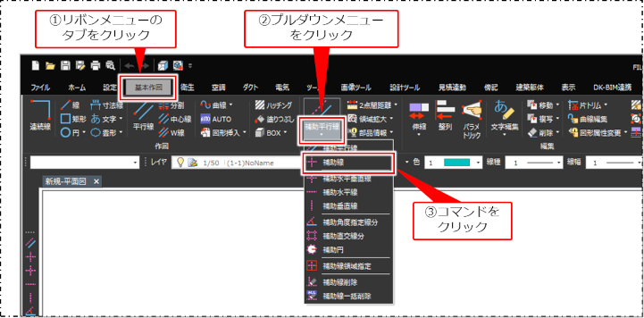 リボンメニューの[基本作図]タブの[補助平行線]プルダウンメニューから[補助線]コマンド(
