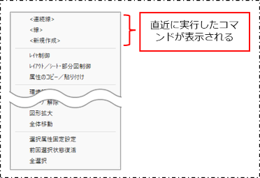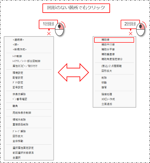 図面上の図形のない箇所で右クリックすると、ショートカットメニューが表示され、コマンドを実行できます。1回目の右クリックと2回目の右クリックで表示されるメニューが異なり、右クリックするごとにメニューが切り替わります。
