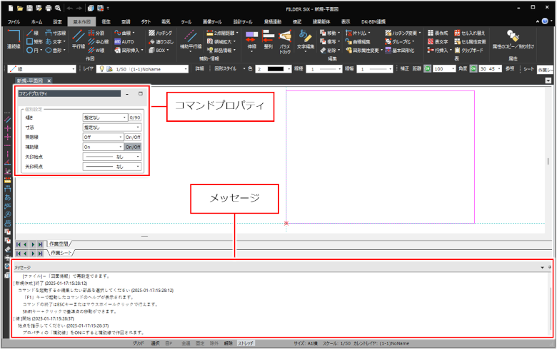 コマンドをクリックして実行すると、[コマンドプロパティ]が表示されます。また、[メッセージ]にはコマンドの操作説明が表示されます。