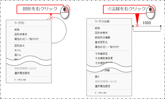 図形や部品の上で右クリックすると、その図形や部品に対して実行できるコマンドのショートカットメニューが表示されます。