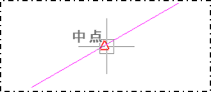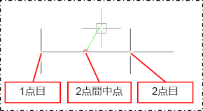 対象の図形の端点から端点までの中点にカーソルを近づけると、「中点」と表示されます。クリックすると、中点を正確に指示できます。 ショートカットメニュー:[中点] |