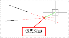 対象となる2つの図形の一方で右クリックしてショートカットメニューの[仮想交点]をクリックし、もう一方の図形をクリックすると、2つの図形の延長上にある仮想の交点が選択されます。座標アシスト表示はなく、ショートカットメニューでの指示になります。 ショートカットメニュー:[仮想交点] 仮想交点の作図方法について、詳しくは以下を参照してください。 |