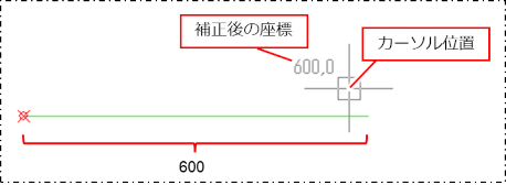 下図は、補正値「100」の場合の線の作図の様子です。カーソルの近くに、補正後の座標が表示されます。カーソル位置のX座標は600より小さいですが、クリックすると座標は「600,0」に補正されます。