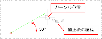 下図は、補正角度「30 45」の場合の線の作図の様子です。カーソルの近くに、補正後の角度が表示されます。クリックすると、角度は「30度,XX」に補正されます。