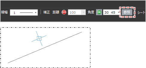 角度を参照すると、[参照]ボタンの背景色が変わり、カーソルの傾きが参照した線分の角度に変わります。