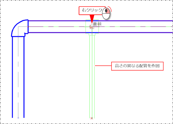 既存の配管に重なる位置まで別の配管を作図し、アシスト表示の[垂線]の位置で右クリックします。