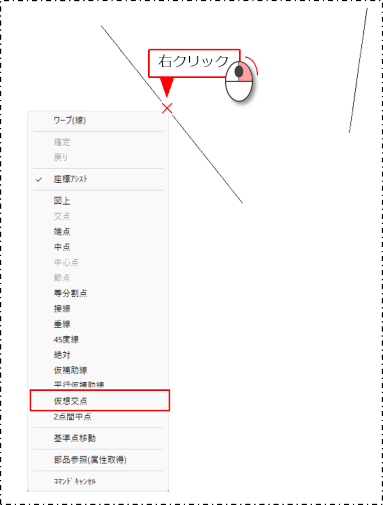 [線]コマンド実行中に、線分を右クリックして表示されるメニューの[仮想交点]をクリックします。