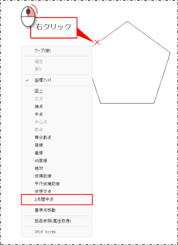 [線]コマンド実行中に、図形上で右クリックして表示されるメニューの[2点間中点]をクリックします。