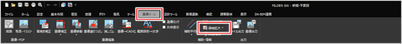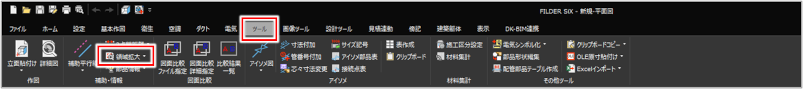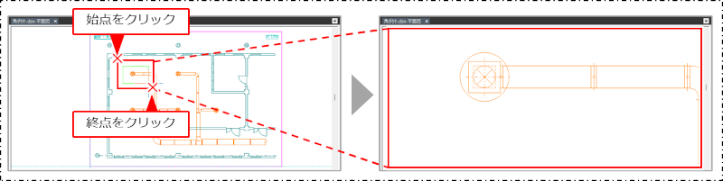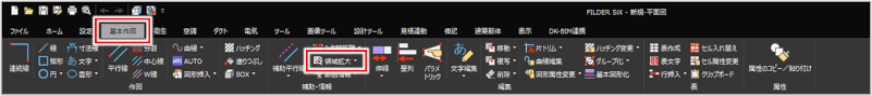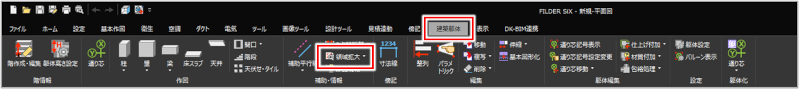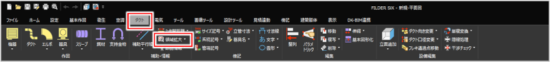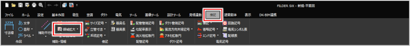 [ホーム]タブ>[領域拡大] [基本作図]タブ>[領域拡大] [衛生]タブ>[領域拡大] [空調]タブ>[領域拡大] [ダクト]タブ>[領域拡大] [電気]タブ>[領域拡大] [ツール]タブ>[領域拡大] [画像ツール]タブ>[領域拡大] [傍記]タブ>[領域拡大] [建築躯体]タブ>[領域拡大] [表示]タブ>[全体表示]プルダウンメニュー>[領域拡大] |