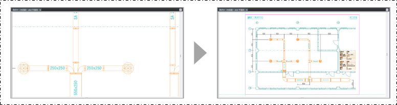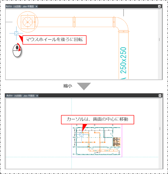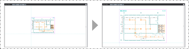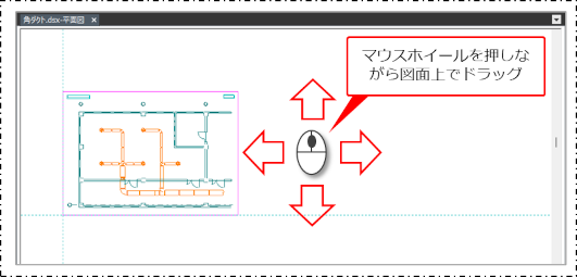 また、[Ctrl]キーを押し、マウスホイールを押しながら右から左にドラッグすると、用紙サイズを基準に図面全体が表示されます。