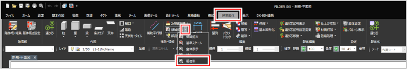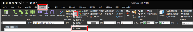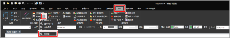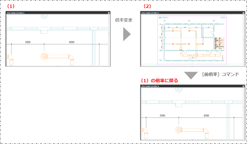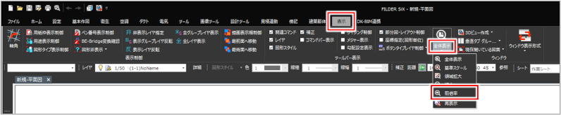 [ホーム]タブ>[領域拡大]プルダウンメニュー>[前倍率] [基本作図]タブ>[領域拡大]プルダウンメニュー>[前倍率] [衛生]タブ>[領域拡大]プルダウンメニュー>[前倍率] [空調]タブ>[領域拡大]プルダウンメニュー>[前倍率] [ダクト]タブ>[領域拡大]プルダウンメニュー>[前倍率] [電気]タブ>[領域拡大]プルダウンメニュー>[前倍率] [ツール]タブ>[領域拡大]プルダウンメニュー>[前倍率] [画像ツール]タブ>[領域拡大]プルダウンメニュー>[前倍率] [傍記]タブ>[領域拡大]プルダウンメニュー>[前倍率] [建築躯体]タブ>[領域拡大]プルダウンメニュー>[前倍率] [表示]タブ>[全体表示]プルダウンメニュー>[前倍率] |