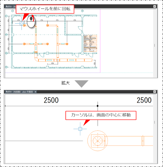カーソル位置を中心に表示を拡大・縮小します。拡大・縮小後のカーソル位置が画面の中心になるように、画面の表示位置が調整されます。