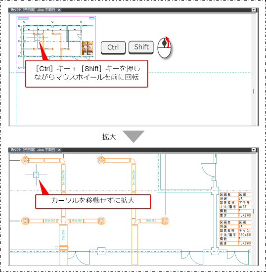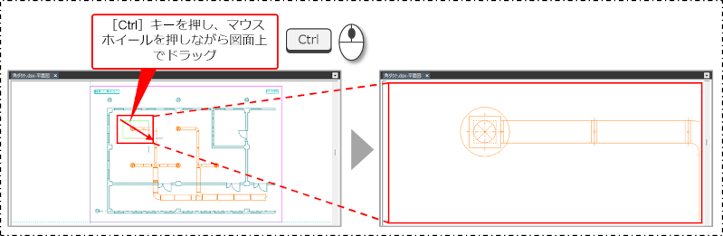 [Ctrl]キーを押し、マウスホイールを押しながら左から右にドラッグすると、指定した範囲が拡大表示されます。