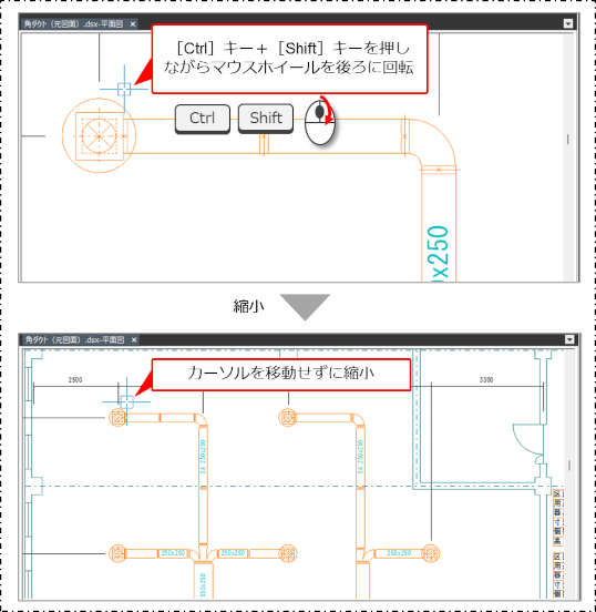 縮小する場合:[Ctrl]キー+[Shift]キーを押しながらマウスホイールを後ろに回転