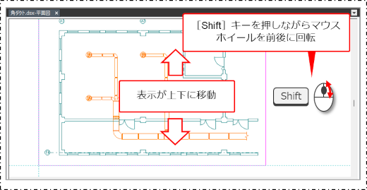 [Shift]キーを押しながらマウスホイールを前に回転すると表示が上に移動し、マウスホイールを後ろに回転すると下に移動します。