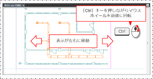 [Ctrl]キーを押しながらマウスホイールを前に回転すると表示が左に移動し、マウスホイールを後ろに回転すると右に移動します。