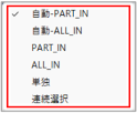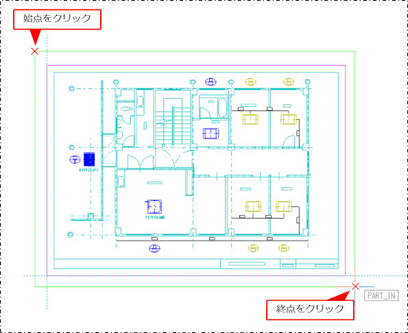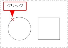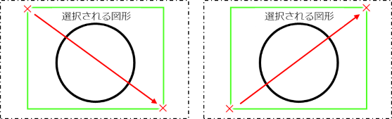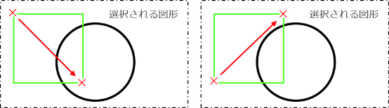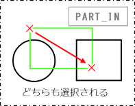 逆に、右から左に範囲選択した場合は[PART_IN]に切り替わり、範囲に一部でも含まれる図形が選択されます。 図形をクリックして選択することはできません。 |