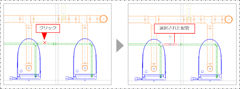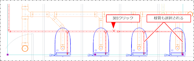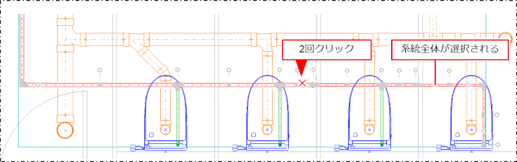 配管やダクトの場合、同じ箇所を2回クリックすると系統が選択でき、3回クリックすると全系統が選択できます。