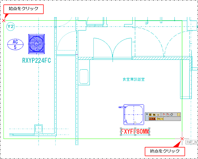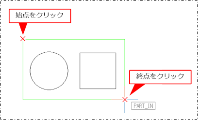 逆に、右から左に範囲選択した場合は[PART_IN]に切り替わり、範囲に一部でも含まれる図形が選択されます。 図形をクリックして選択することもできます。 |