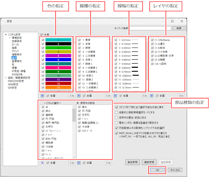 選択対象にする色、線種、線幅、レイヤ、部品種類などにチェックを付け、[OK]ボタンをクリックします。