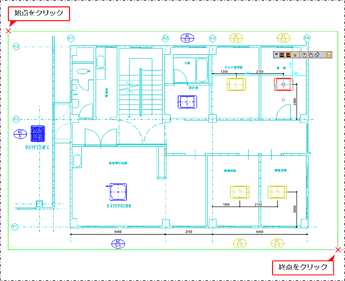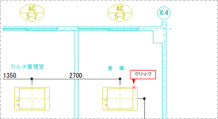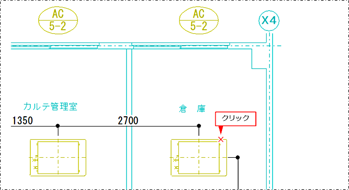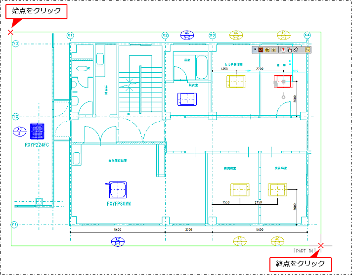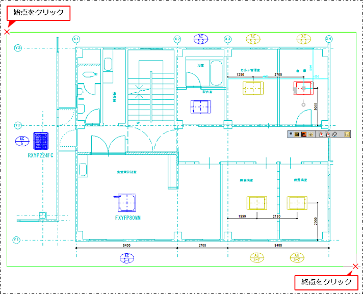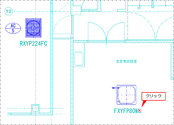 図形をクリックして選択します。配管・ダクトの場合は、区間指示選択となります。 範囲選択はできません。 |