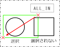 逆に、右から左に範囲選択した場合は[ALL_IN]に切り替わり、範囲に全体が含まれる図形のみが選択されます。 図形をクリックして選択することはできません。 |