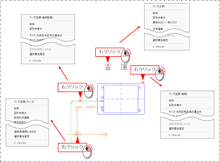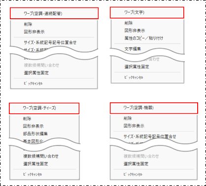 ショートカットメニューの最初に[ワープ(空調-連続配管)]や[ワープ(文字)]のように、右クリックした図形に応じたワープメニューが表示されます。