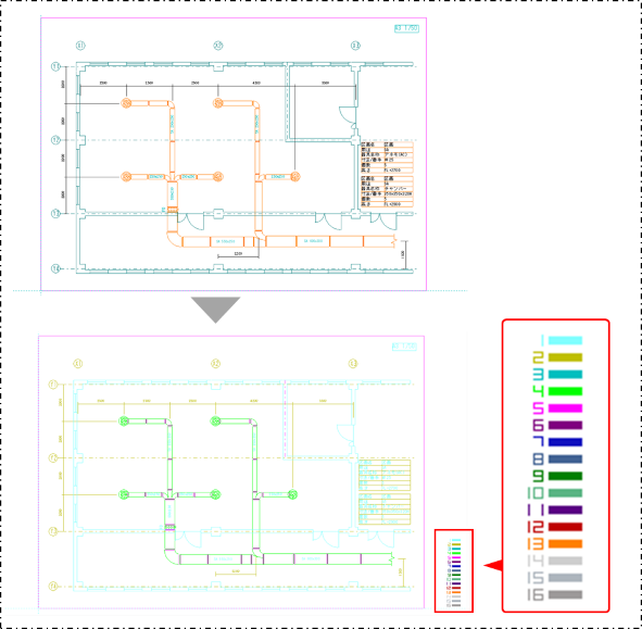 デフォルト設定では、図形は設定した色で表示されますが、ペン番号ごとに設定された色に表示を切り替えることができます。ペン番号とは図形が持つ線幅の番号です。