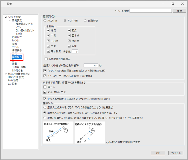 座標方向の指定方法を設定します。指示方法は、マウスカーソルの方向で指示する方法と、プラス・マイナスの数値で指示する方法があります。