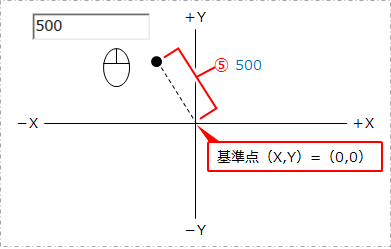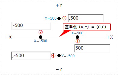①「500」:基準点からX軸+方向に500、Y軸方向に0